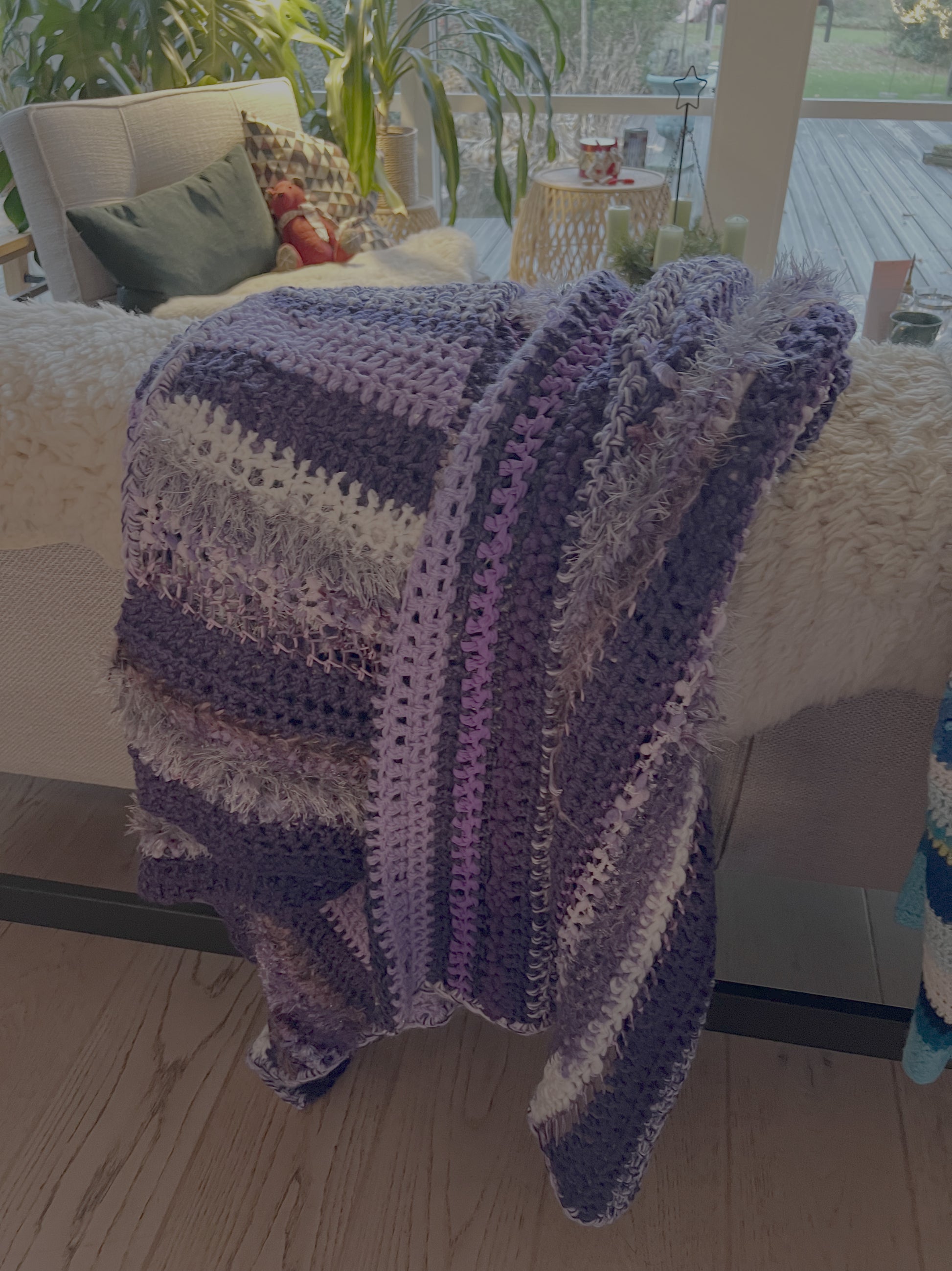 Dette hæklede tæppe er håndlavet og fremstår med et enkelt og funktionelt udtryk. Små variationer i struktur og overflade er en naturlig del af håndarbejdet og påvirker ikke tæppets anvendelse.